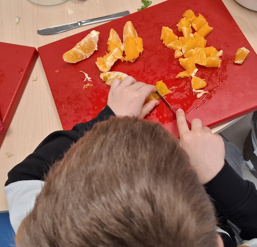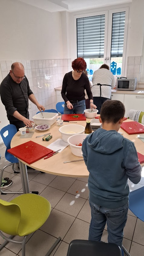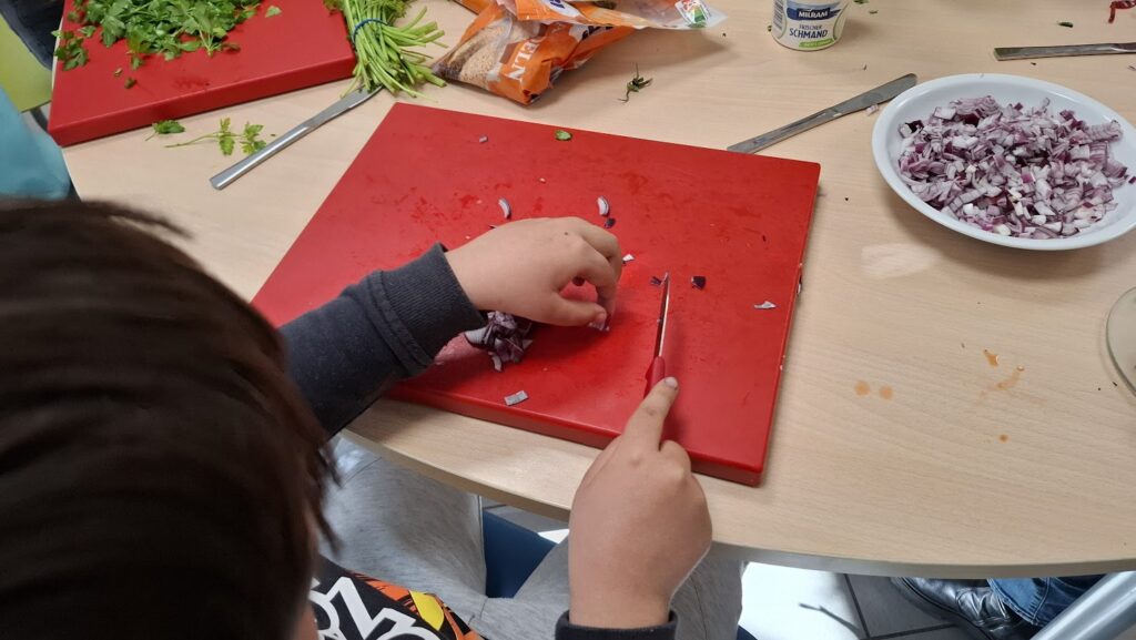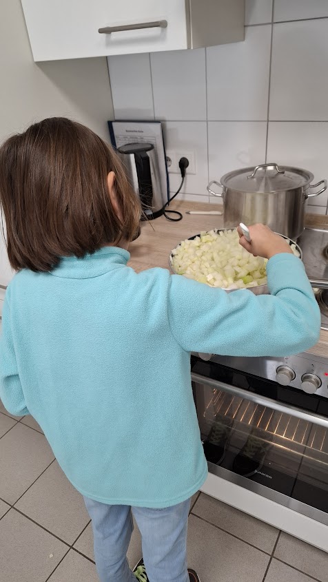 Nach einer kurzen Vorstellung der Teammitglieder erläuterte die Gruppe ihr Motto „Vegetarisch, saisonal, regional“, das im Zeichen des Klimaschutzes steht. Anschließend ging es nach dem Händewaschen direkt in die Küche, um ein schmackhaftes vegetarisches Menü zuzubereiten. Als Vorspeise gab es einen bunten Salat mit Joghurtdressing, gefolgt von einem vegetarischen Nudelauflauf als Hauptgericht. Den süßen Abschluss bildete ein veganer Bratapfel-Crumble mit Marzipanstreuseln und veganem Sojajoghurt. Die Kinder hatten viel Freude bei der Zubereitung des Menüs und waren mit besonderer Begeisterung beim „Schnibbeln“ frischer Zutaten wie Eisbergsalat, Möhren, Kohlrabi, Radieschen, Zwiebeln, Schalotten und Kräutern dabei. Um das Bewusstsein für Resteverwertung und Nachhaltigkeit zu schärfen, wurde aus den Gemüseschalen eine gesunde Gemüsebrühe gekocht, die in Gläser abgefüllt wurde und als eine gute Alternative zu industriell hergestellten Brühwürfeln verwendet werden kann. Nach über zwei Stunden gemeinsamer Vorbereitung war der Hunger groß, und alle genossen gemeinsam das köstliche 3-Gänge-Menü.