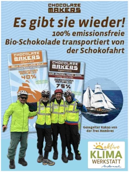 Die beliebte Schokolade kann dann ab Mittwoch, den 26. November, im Weltladen Andernach erworben werden. Begleitet werden die vier Schokofahrer diesmal von Sabine Schmitz vom Weltladen.