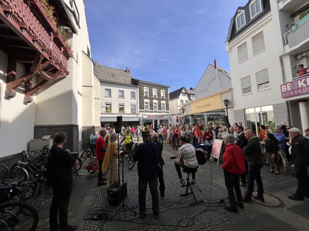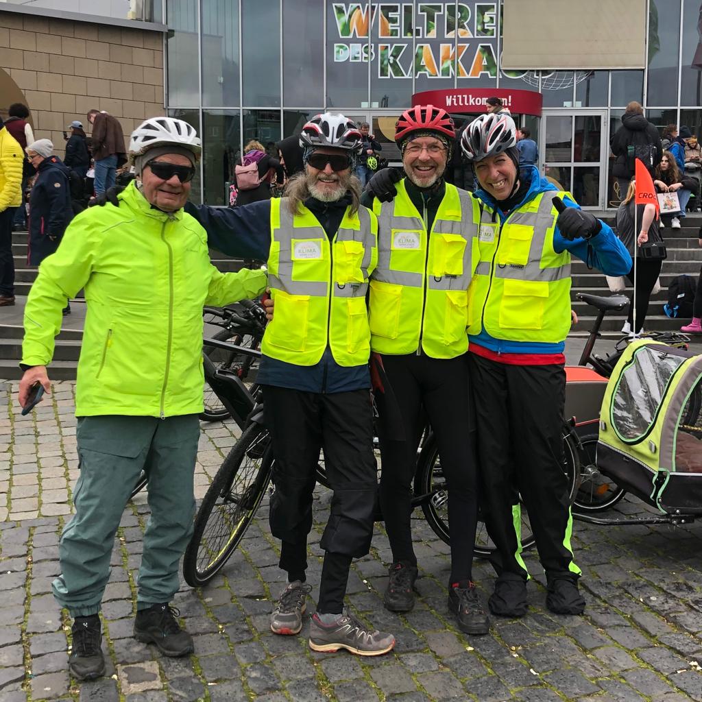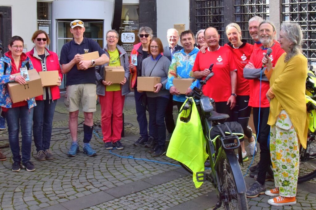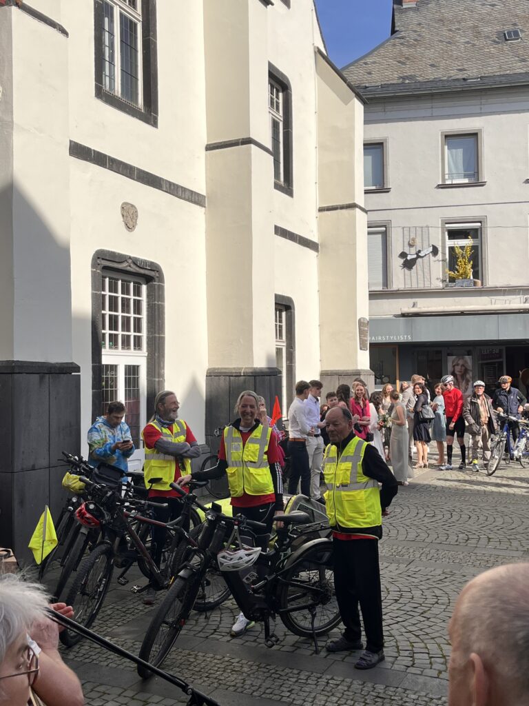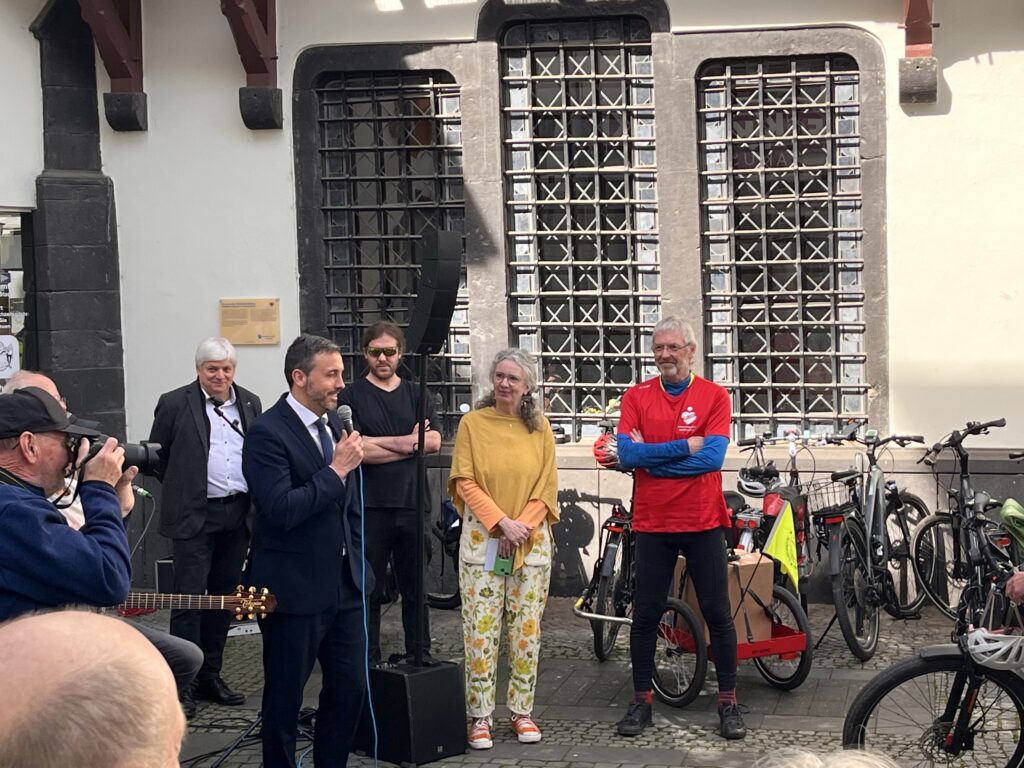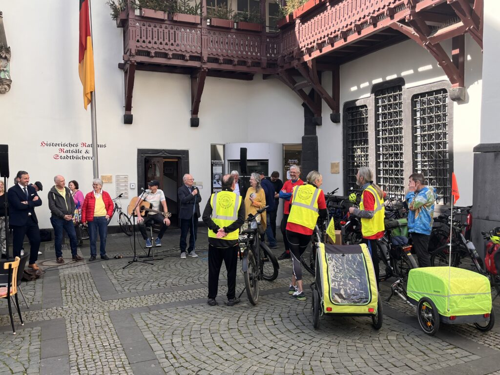 Bei strahlendem Sonnenschein wurden die vier Radler der Klimawerkstatt: Bettina Anedda, Norbert Dümpelfeld, Karl-Heinz Weingart und Peter Schmitz mitsamt ihrer süßen Fracht vor dem historischen Rathaus mit großer Anteilnahme zahlreicher Bürgerinnen und Bürger empfangen.
