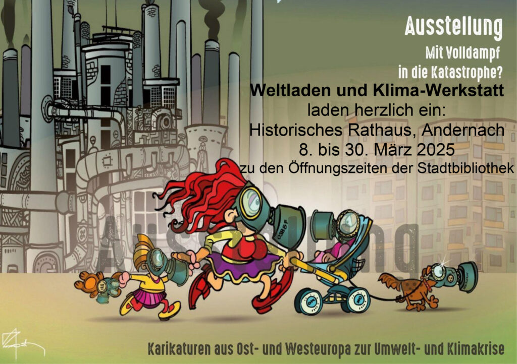 Mit Volldampf in die Katastrophe?“ so lautet der Titel der Ausstellung die von dem Weltladen Andernach und der Klima-Werkstatt der Ehrenamtsinitiative „Ich bin dabei!“ Andernach in der Zeit vom 8. bis zum 30. März 2025 im Historischen Rathaus gezeigt wird. In der von Renovabis, dem Osteuropa-Hilfswerk der katholischen Kirche aufgelegten Ausstellung haben Künstlerinnen und Künstler aus Ost- und Westeuropa aus ihren sehr unterschiedlichen Perspektiven die globalen Herausforderungen von Umweltzerstörung und Klimawandel als Karikaturen kreativ ins Bild gesetzt. Sie zeigen, wie unterschiedlich die wirtschaftlichen Realitäten sowie die gesellschaftlichen Prägungen und Ausdrucksformen sind. Sie regen zum Nachdenken und zum Austausch darüber an, wie „man“ dem Klimawandel konstruktiv begegnen kann.